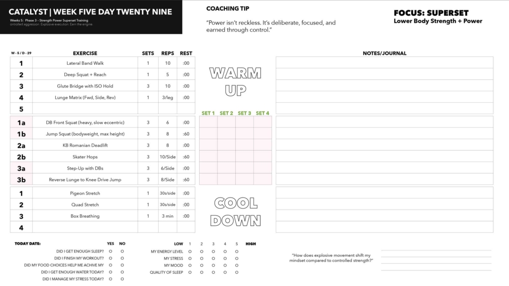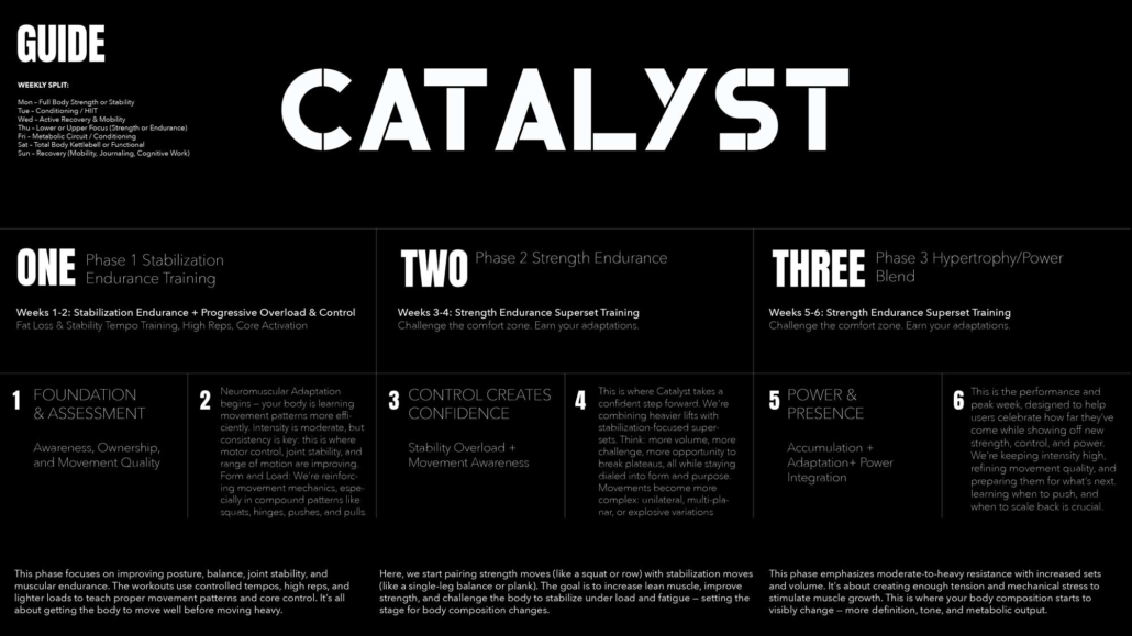 This comprehensive plan is designed to help you shed excess body fat, build sustainable habits, and achieve remarkable results. Whether you’re just starting or need a fresh approach, Catalyst provides the tools, guidance, and structure to empower you to take control of your fitness and wellness.